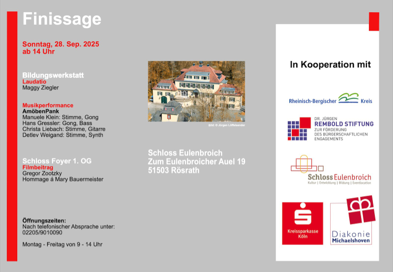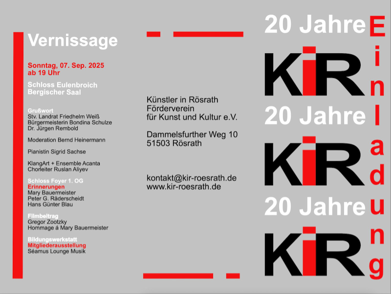 In diesem Jahr feiert KiR Förderverein für Kunst und Kultur e.V.  in Rösrath sein 20-jähriges Bestehen. ENGELsART gratuliert ganz herzlich und wünscht eine tolle Veranstaltung im Schloss Eulenbroich Rösrath – vom 7. bis 28. September 2025. Weitere Infos im Flyer …