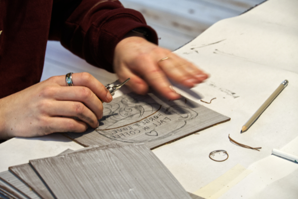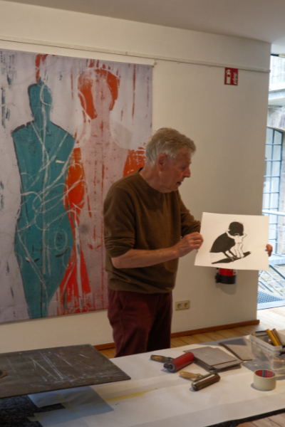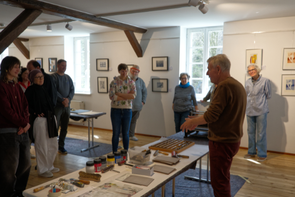 Parallel zur Ausstellung „Druck & Poesie“ gab es einen kleinen Workshop. Am 11. April zeigten Rainer Aring und einige andere beteiligte Künstlerinnen, wie Drucke hergestellt werden. Auf Linolplatten, CD oder Tetrapack, mit Werkzeug und Nadeln sowie Farben und natürlich mit einerDruckpresse.